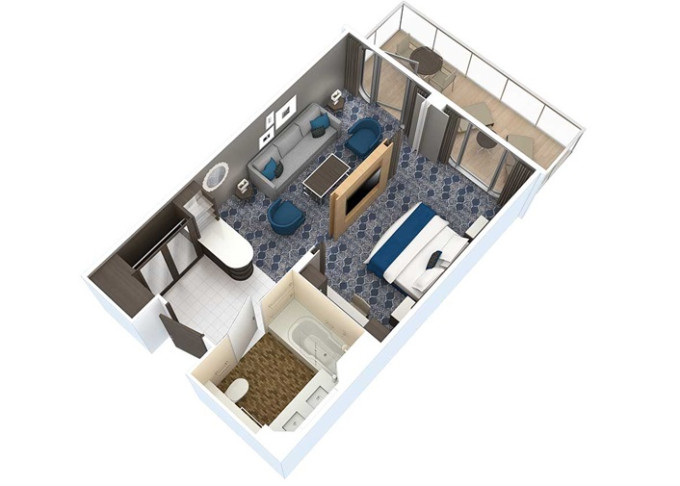 1A - Veľká kajuta s veľkým balkónom Ultra Spacious 25 m² + balkón 7,5 m². Oddelená časť s poschodovou posteľou. Max 6 osôb. 4 410 € 4 410 € za osobu