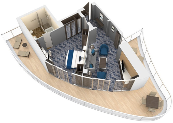 OS - Owner’s Suite s balkónom 51,5 m² + balkón 22 m². Max 4 osoby. Výhody Royal Suite Sky Class. 9 490 € 9 490 € za osobu